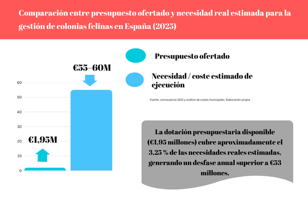 Un municipio medio de 5.000 habitantes con un problema documentado de colonias felinas no tiene ninguna posibilidad práctica de obtener esta financiación. Y lo más grave es que la ley que genera la obligación no menciona de dónde vendrán los recursos.