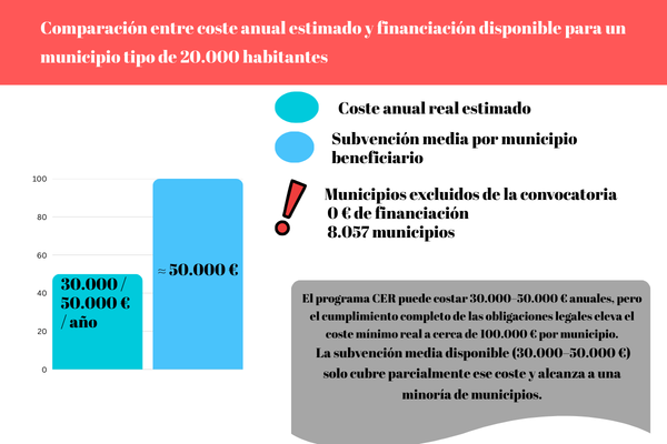 - En un municipio de 20.000 habitantes, un programa CER puede suponer unos 30.000-50.000 € anuales, pero el cumplimiento completo de las obligaciones legales eleva el coste mínimo real a cifras próximas o superiores a los 100.000 €.